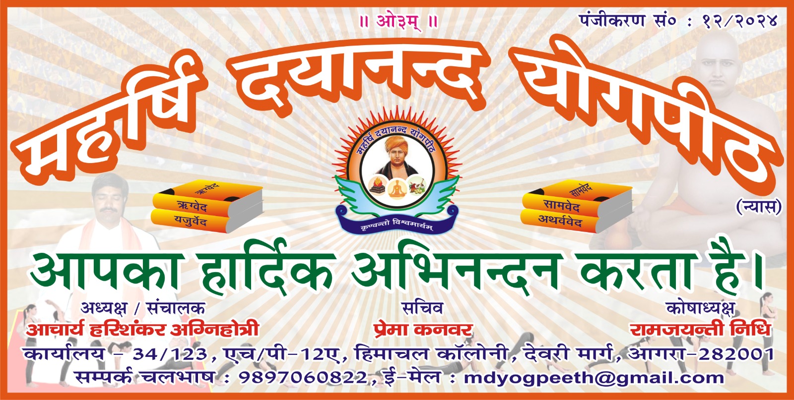 महर्षि दयानन्द योगपीठ द्वारा वेद प्रचार और समाज सुधार से सम्बन्धित अनेक योजनाबद्ध कल्याणकारी गतिविधियां निरन्तर चलायी जारही हैं। जिनसे ऋषि मिशन – कृण्वन्तो विश्वमार्यम् को गति प्रदान की जा सके। यदि आप सहयोगी बनाना चाहे जो बड़ी कृपा होगी। आप हमें सूचित करें हम आपसे सम्पर्क करेंगे। सम्पर्क सूत्र – 9897060822 न्यास की बैंक…