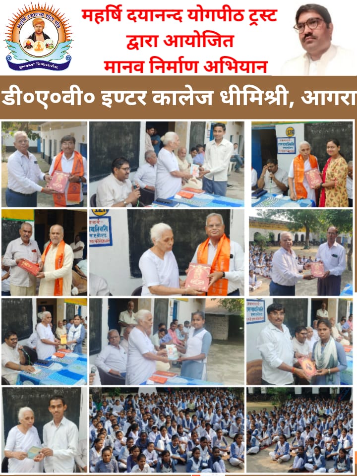 दिनांक २३ सितम्बर २०२४ दिन सोमवार आश्विन कृष्णपक्ष षष्ठी संवत् २०८१ को ८:०० बजे से आदरणीय श्री विवेकानन्द गुप्ता जी के नेतृत्व में डी० ए० वी० इण्टर कालेज धीमिश्री, आगरा में कार्यक्रम आयोजित किया गया है, जिसमें अतिथि के रूप में सद्भावना जन कल्याण ट्रस्ट की अध्यक्षा माता श्रीमती त्रिवेणी आनन्द जी उपस्थित हुईं तथा आर्य समाज धीमिश्री के प्रधान श्रीमान् राजेन्द्र प्रसाद तिवारी और श्री महेन्द्र सिंह रघुवंशी जी उपस्थित हुए । कार्यक्रम में छात्राओं से चर्चा के उपरान्त प्रश्न पूछे गये सही उत्तर देकर छात्राओं ने पुरस्कार प्राप्त किया।