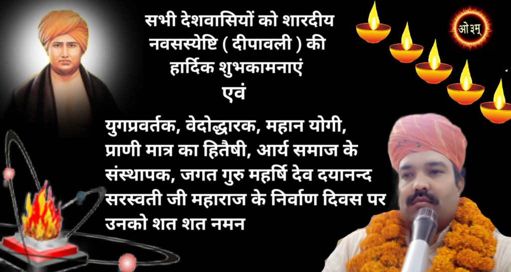 आर्य समाज के संस्थापक, महान योगी, प्रसिद्ध समाज सुधारक, वेदोद्धारक, युगप्रवर्तक, जगत गुरु महर्षि दयानन्द सरस्वती जी महाराज का दीपावली की सांय 30 अक्तूबर 1883 को अजमेर में निर्वाण हुआ।